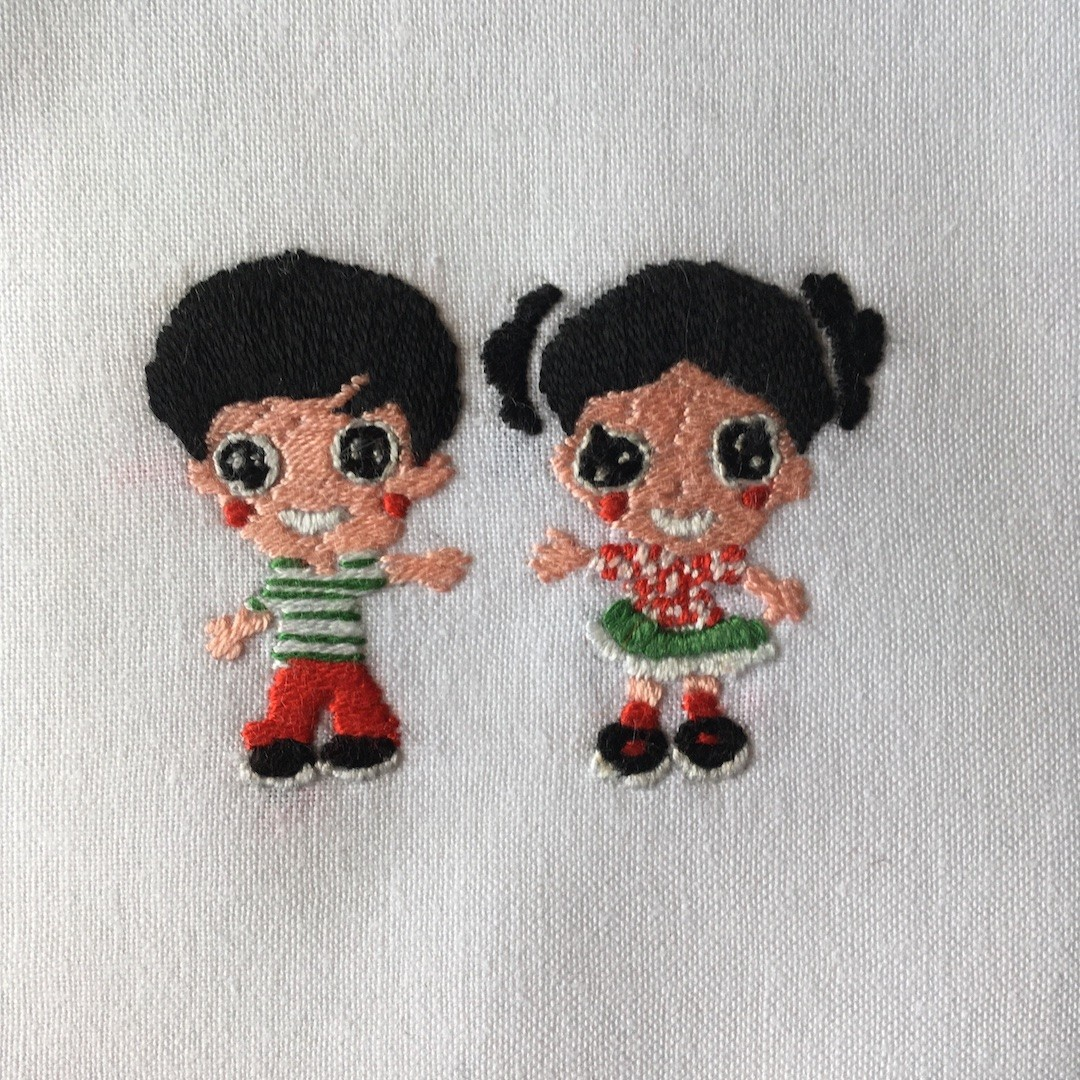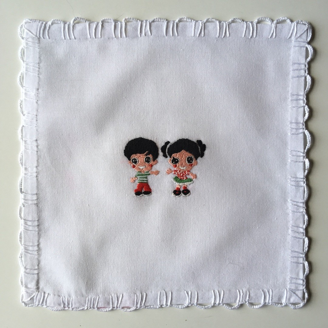 Hand embroidered pixie on white cotton square, edged with a variation of blanket stitch. Approximately 20 cm by 20 cm.