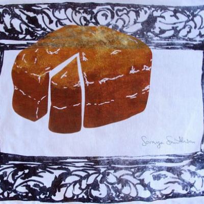 100% white cotton tea-towel with a reproduction of a lino and lithographic print made as part of my 'A Cake for Every Day' project in 2009.