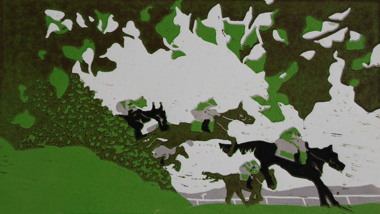 Reduction lino print of horse racing, image derived from a news photograph.