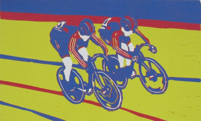 Reduction lino print of cycle racing, image derived from a news photograph.